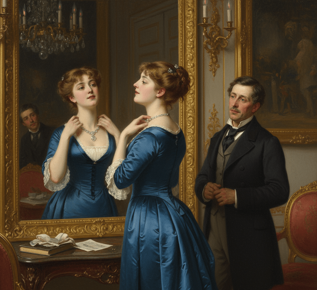 She removed her wraps before the glass so as to see herself once more in all her glory. But suddenly she uttered a cry. She no longer had the necklace around her neck!